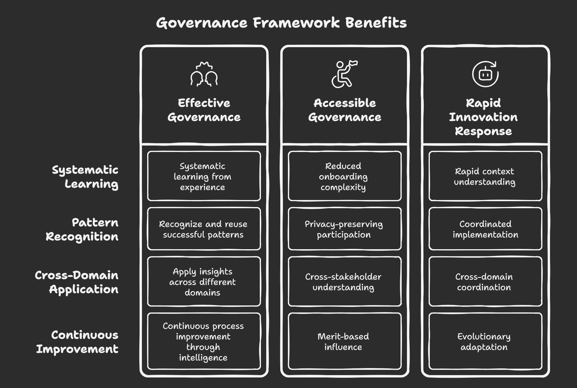 The agentic framework enables governance communities to access their collective intelligence more systematically, learning from historical experience and applying successful patterns to new challenges while preserving the stakeholder reasoning and competitive considerations that make governance patterns effective.