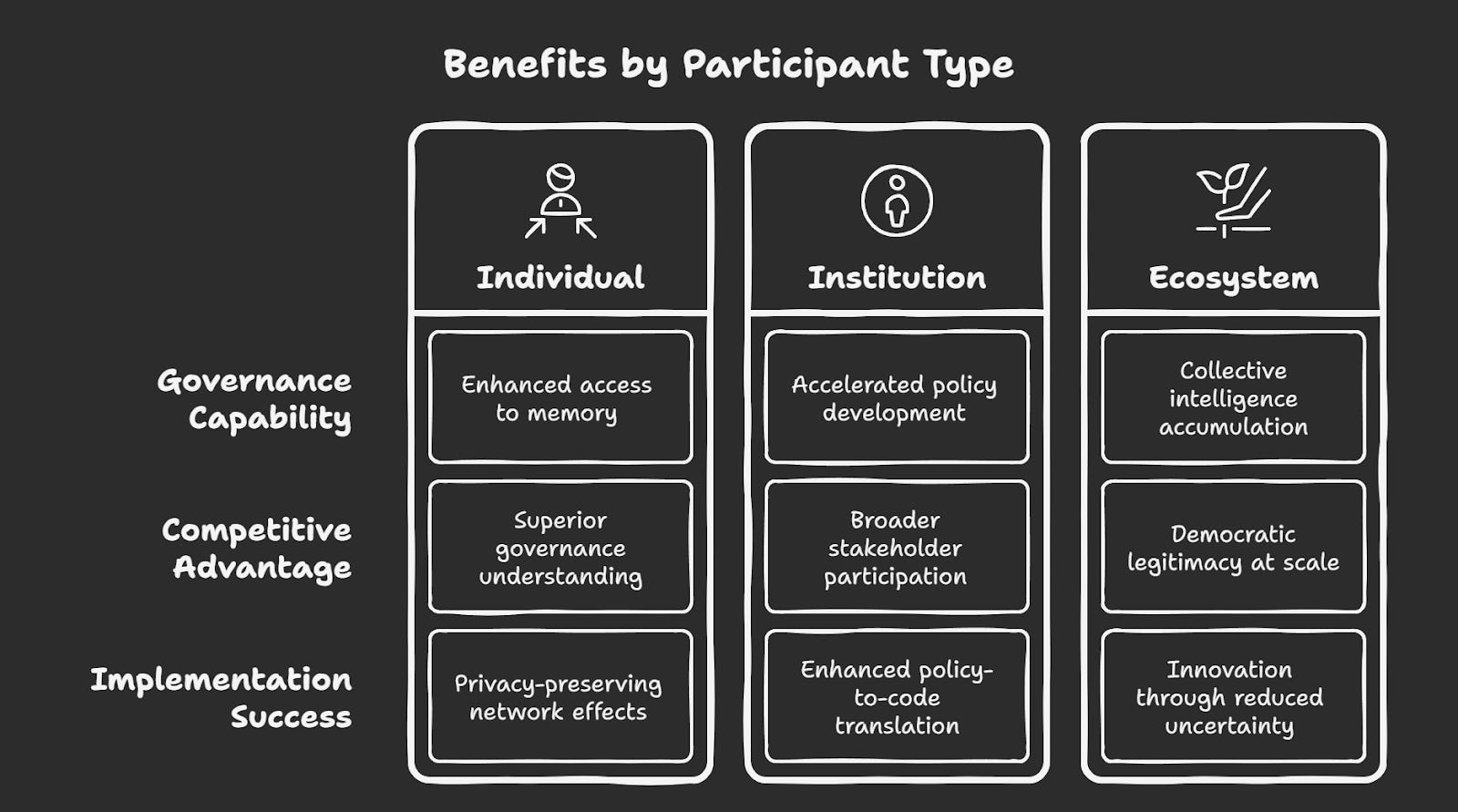 The governance community accumulates institutional intelligence as a public good while preserving individual competitive advantages, creating compound value that benefits all participants without compromising individual sovereignty.