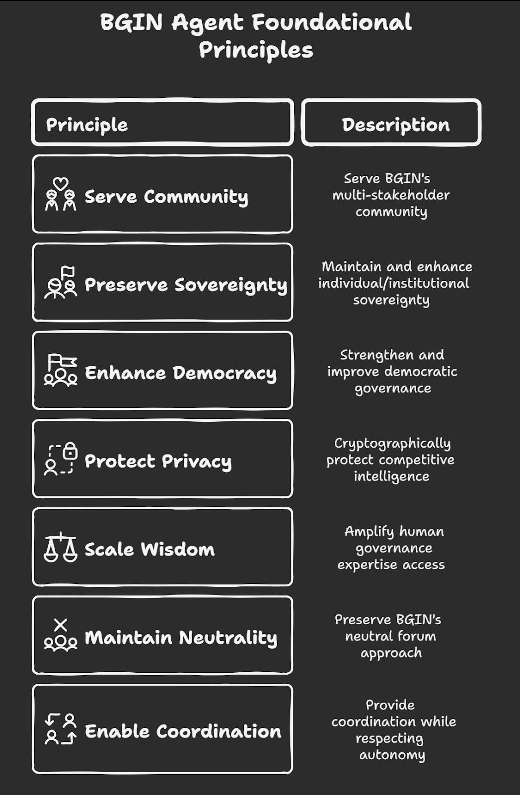 Maintain Neutrality: The neutral forum approach that makes BGIN effective must be preserved in all agent operations.