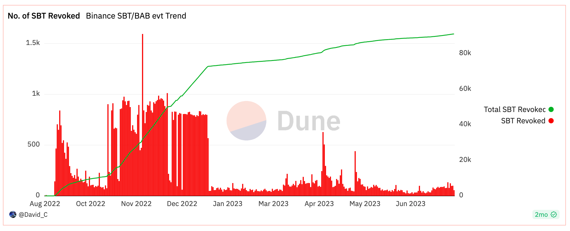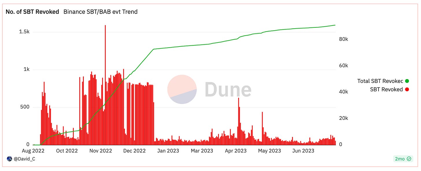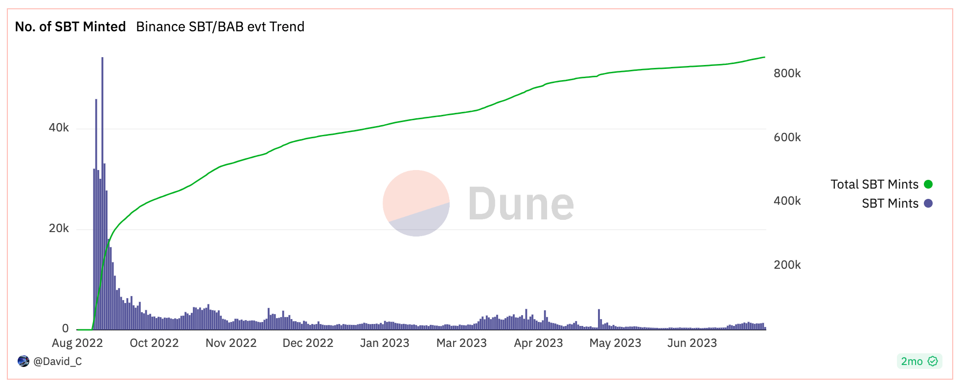 Thanks to Twitter user @coinbender_lfg, for publishing the Dune Analytics Dashboard ‘Binance Soulbound Token/SBT (BABT). (David_C, Dune Analytics Alias) Most up-to-date results are 2 months old.