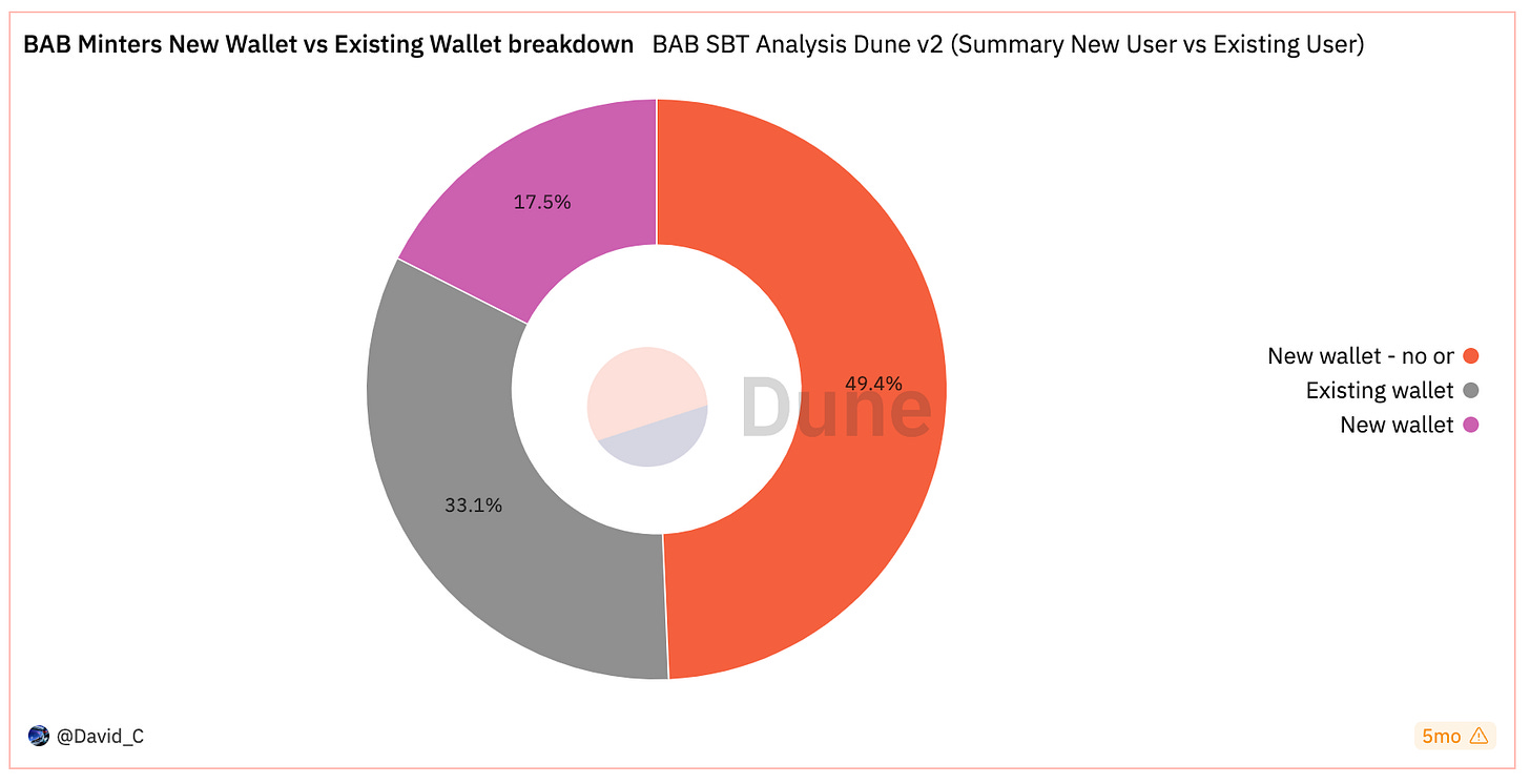 The Dune Analytics dashboard delineates between the BAB mint address’s activity and age, detailing mint addresses that are either a) new (w/o activity), b) new (w/ activity, or c) existing. This delineation is fundamental to evaluating the efficacy of Account-bound tokens issued by centralised exchanges as a means to ‘onboarding the next billion’ users to DeFi.