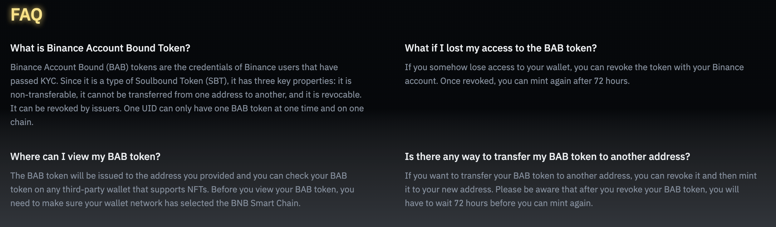 The Binance Account-bound Token, or rather BAB is a ‘soulbound token’ minted on BNB Chain and represents a user’s successful Binance Exchange Know-Your-Customer (KYC) result. Binance released the new feature exclusive to Binance customers in September, 2022. By 'binding' a user’s successful KYC result to the BAB token, Binance potentially strengthened its compliance measures, and showcased a practical use-case for soulbound tokens.