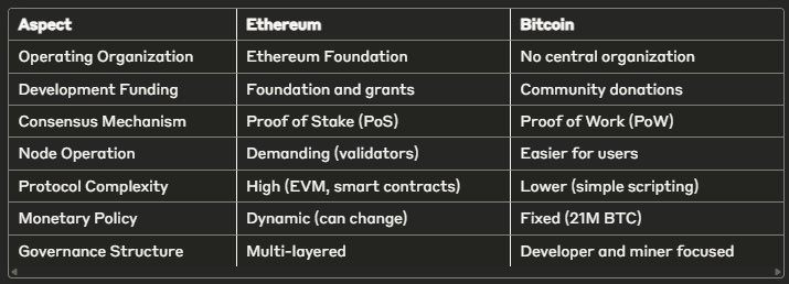 Ethereum's pluralistic governance contrasts with Bitcoin's more rigid approach