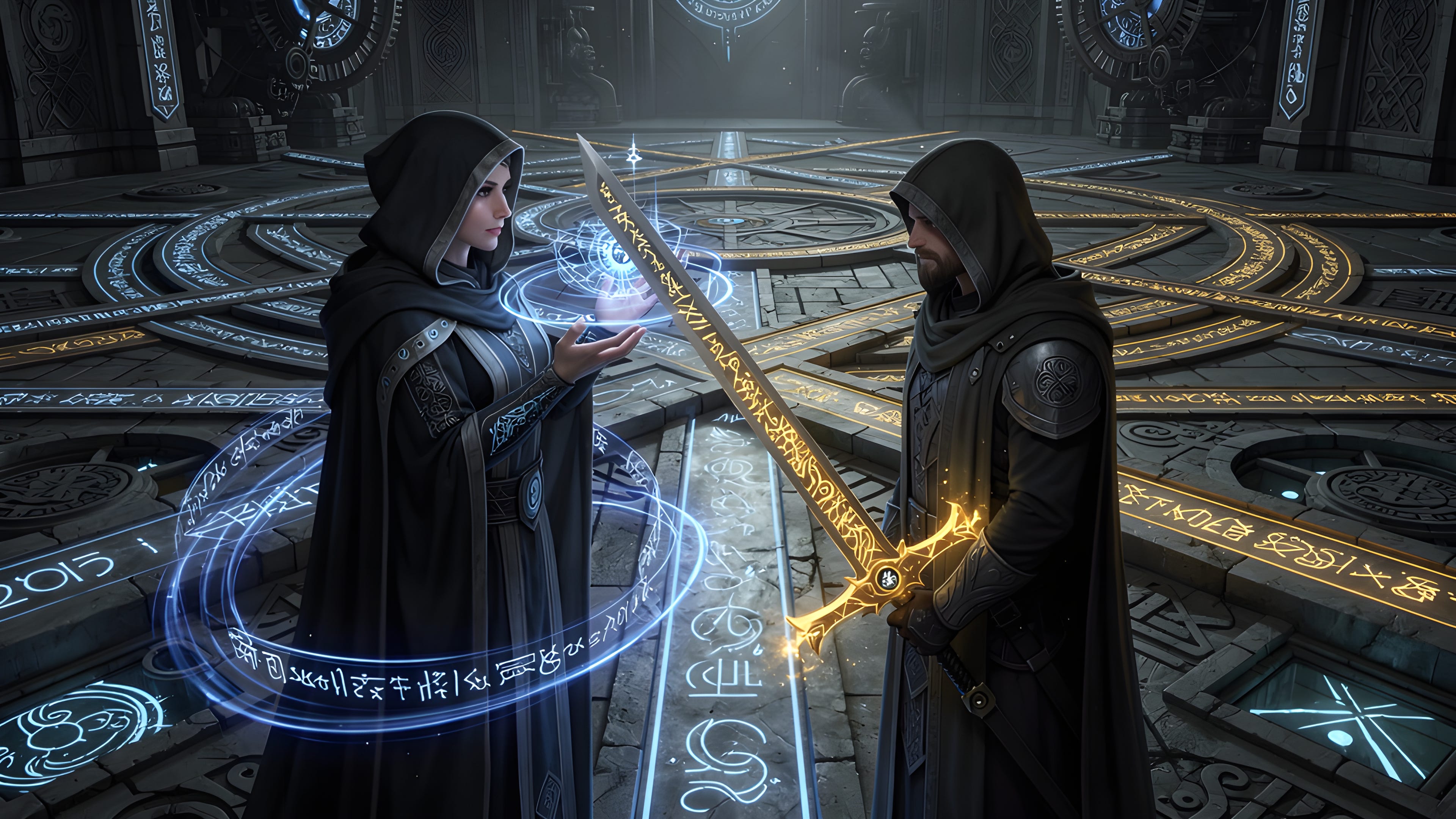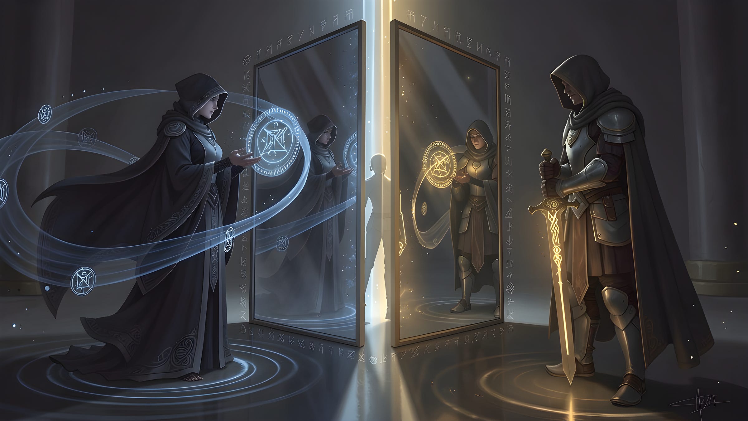 Then the ceremony unfolded in two movements. The Swordsman forged. The Mage verified in private — matching every field to the architecture, confirming Hex 3F mapped to binary 111111, expanding the inscribed spell symbol by symbol. Then the Mage testified in public — reconstructing the blades for an audience who had never seen the forge data, drawing on episodic memory of the private verification.