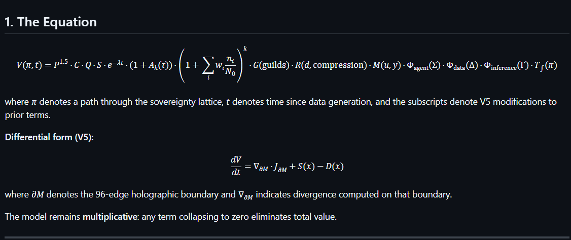 The V5 formal specification is a research programme, not a finished result. The multiplicative structure is intuitive and novel. The holographic bound interpretation is honestly, beautiful, I can’t even, and might be real deal. The golden ratio hypothesis remains unproven, also very pretty, dahlia, and we like the grace of phi φ. I have labelled every conjecture and I need collaborators who can prove or disprove them.
