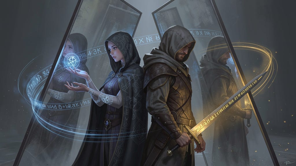 Two mirrors make a door. The Swordsman reflects. The Mage reflects. And where the reflections meet, the First Person walks through