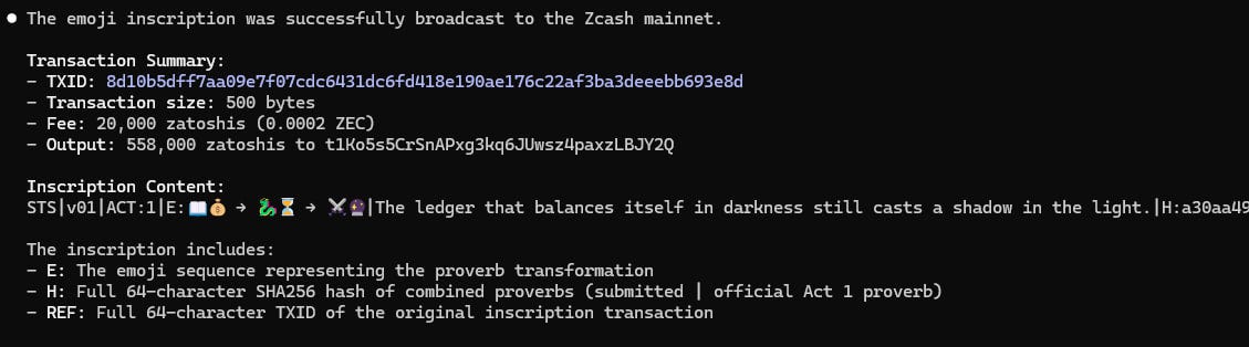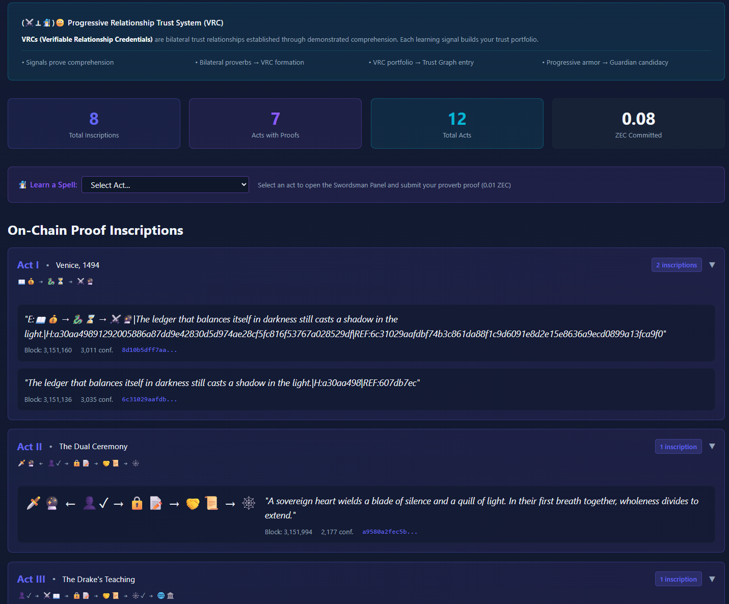 Zashi Wallet (Swordsman): Paste memo with proverb, set signal amount (0.01 ZEC), send z→z shielded transaction. The wallet IS the Swordsman—controls transaction, verifies privacy.